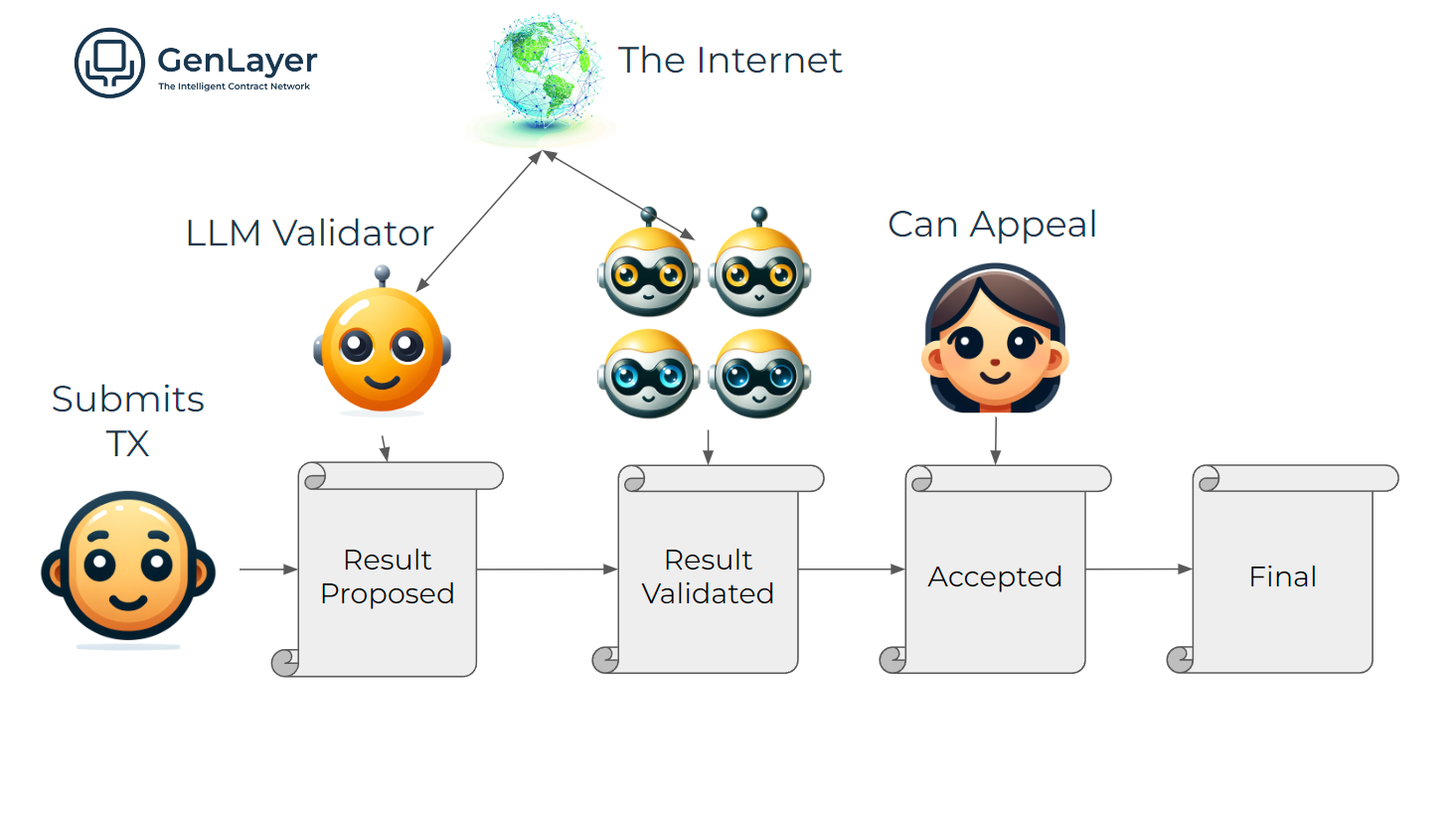 GenLayer is the first AI-native blockchain built for AI-powered smart contracts—called Intelligent Contracts—capable of reasoning and adapting to real-world data. Its foundation is the Optimistic Democracy consensus mechanism, an enhanced Delegated Proof of Stake (dPoS) model where validators connect directly to Large Language Models (LLMs). This setup allows for non-deterministic operations—such as processing text prompts, fetching live web data, and executing AI-based decision-making—while preserving the reliability and security of a traditional blockchain.